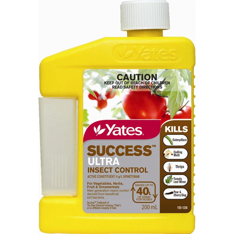 Yates Success Ultra controls a variety of leaf-eating caterpillars and vegetables, herbs, fruit and ornamentals. It also controls against codling moth