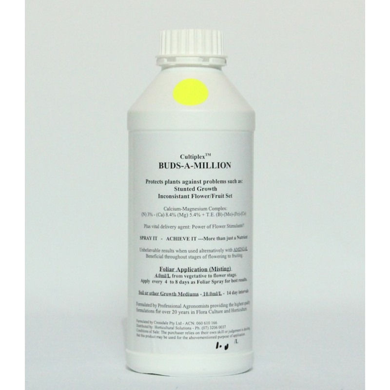 Buds A Million Liquid Calcium Magnesium Complex Protect plants agains problems such as Stunted Growth and Inconsistant Flower set. Calcium Magnesium complex (N)3% (Ca)8.4% (Mg)5.4+T.E-(B)-(Mo)-(Fe)-(Co) Plus Vital delivery agent: power of flower Stimulants!!! SPRAY IT- ACHIEVE IT- More than just a nutrient. Unbelievable results when used alternately with AMINO K Beneficial throughout all stages of flowering or fruiting. Best as Foliar application 4.0ml/L. Vegative - Flower 4-8 day intervals. Use in conjunction with AMINO K for even better results.