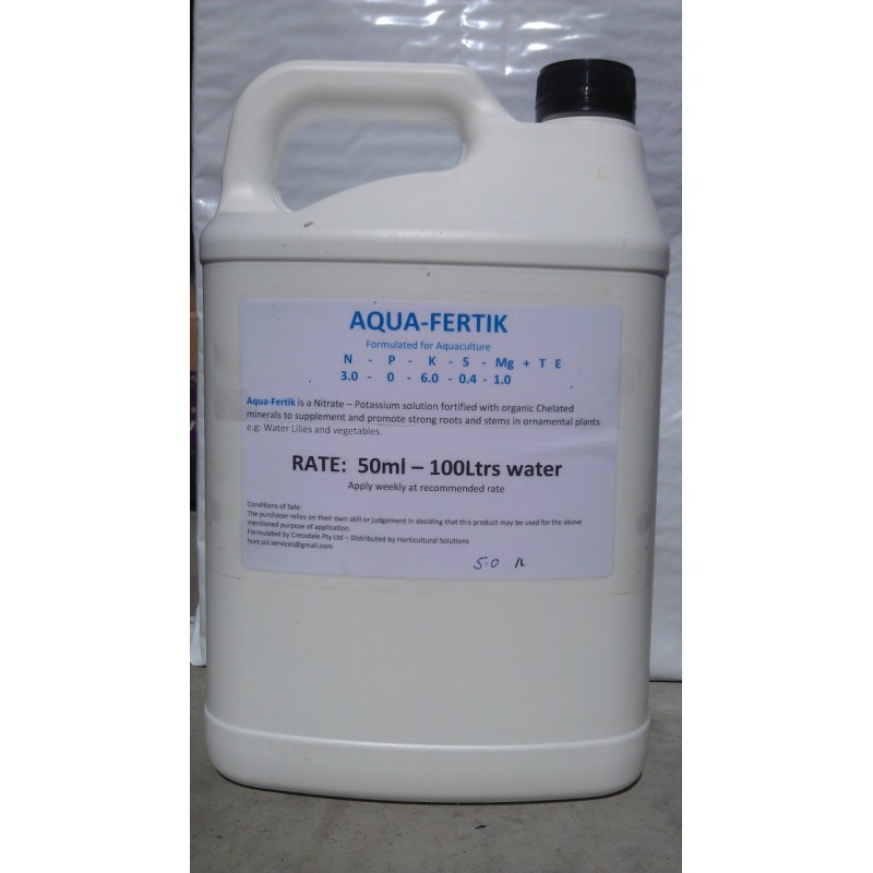 Aqua Fertik is a specially formulated, supplimental fertiliser for use in Aquaponic systems. It is totally safe to use with fish. It is formulated using Potassium,